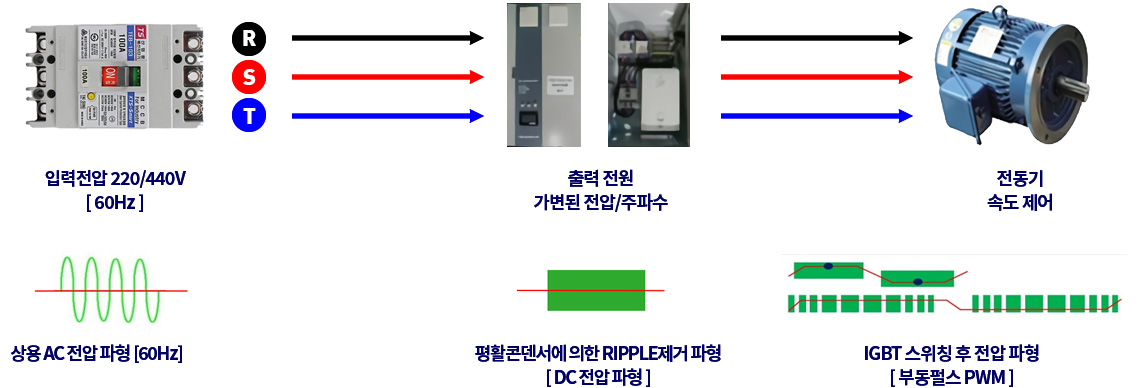 인버터는 엄밀하게 말하면 직류전력을 교류전력으로 변환하는 장치 이지만 우리가 쉽게 얻을 수 있는 전원이 교류이므로 교류전원으로부터 직류를 얻는 장치까지를 인버터 계통에 포함시키고 있다.